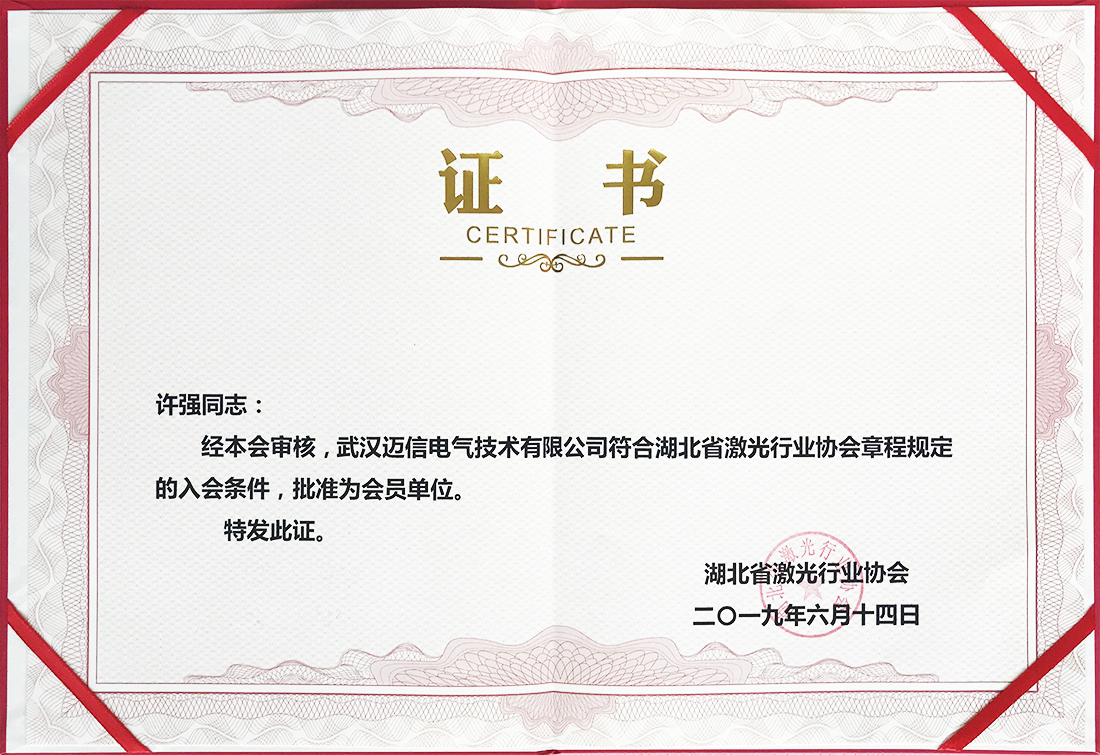 2019年6月,邁信電氣受邀加入湖北省激光行業協會,成為會員單位。在此感謝廣大客戶、行業協會領導及同仁的支持與認可!邁信電氣將繼續致力于伺服技術研究、鉆研應用行業工藝需求、嚴把產品質量,促進國內激光行業繁榮發展,提升激光行業核心部件國產化率!