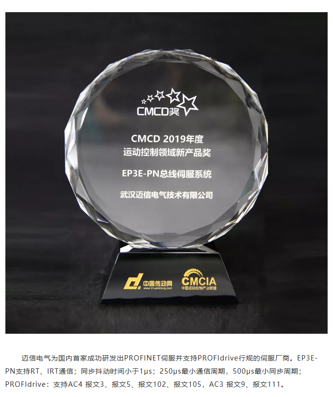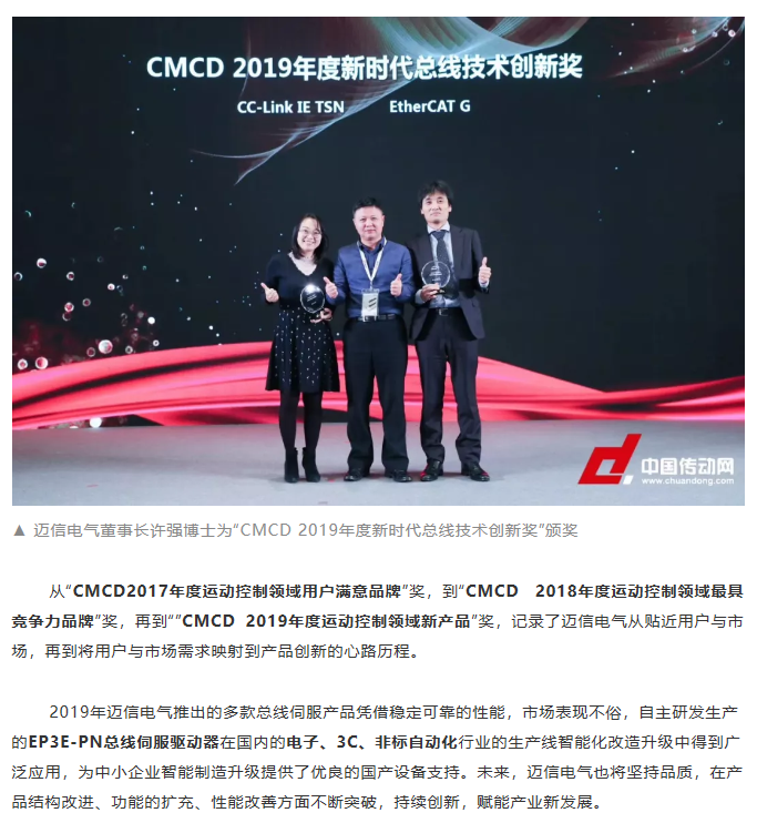 首頁>文章中心>公司新聞>專注產(chǎn)品 順應市場 | EP3E-PN榮獲CMCD 2019年度運動控制領域新產(chǎn)品獎