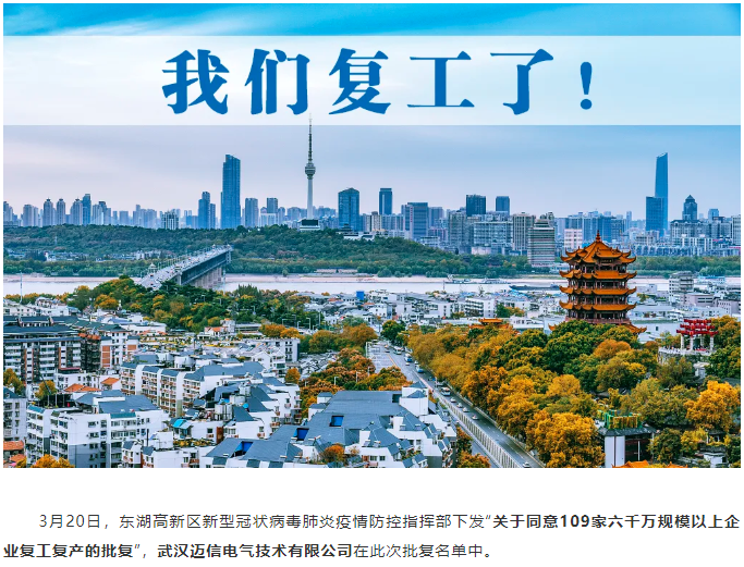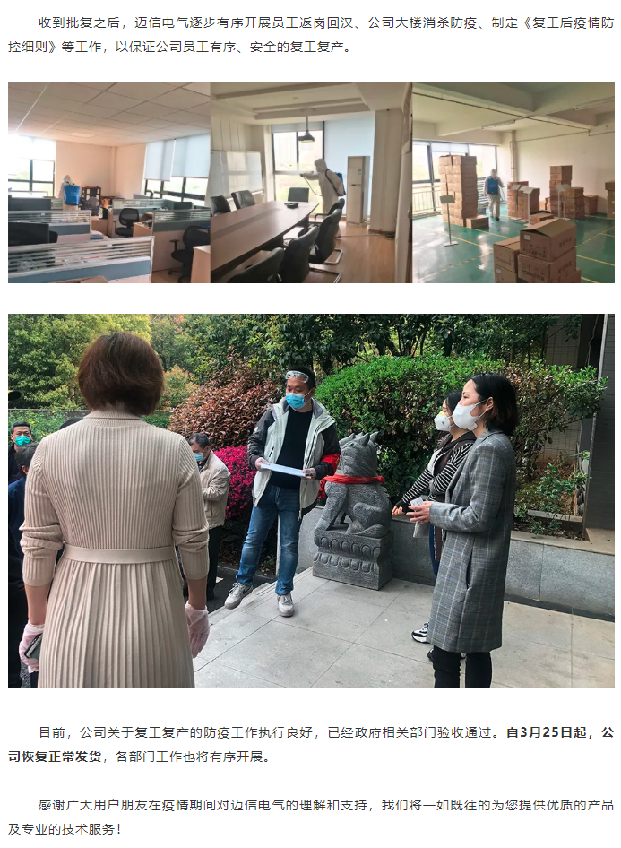 首頁(yè)>文章中心>公司新聞>復(fù)工了!邁信電氣于3月25日正式恢復(fù)生產(chǎn)發(fā)貨!