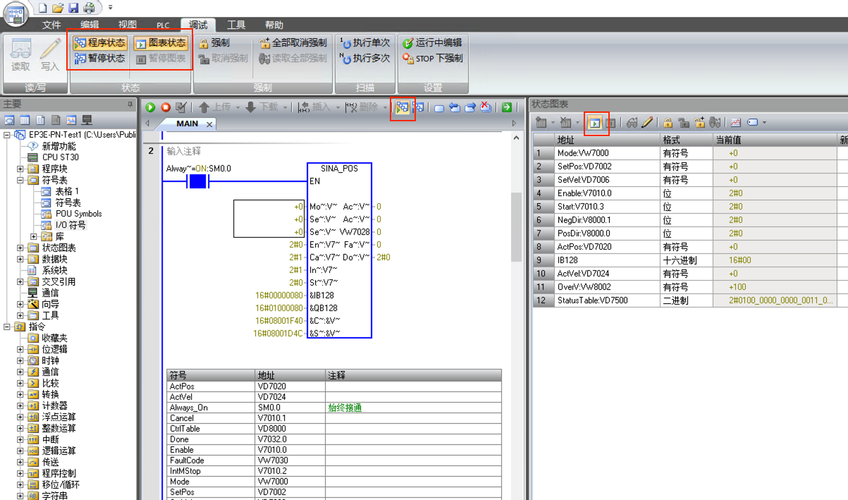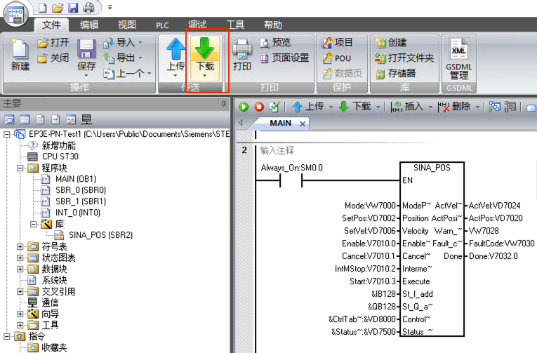 7. 主程序中編寫程序,SINA_POS功能塊的St_I_add和St_Q_add的地址與步驟5中111報文的輸入輸出地址對應