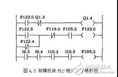 根據工作原理,分度的齒條和齒輪嚙合,這個動作是靠液壓裝置來完成的,由PLC輸出Q1.4控制電磁閥YVl4來執行。PLC相關部分的梯形圖如圖4.3。通過數控系統的DIAGNOSIS中的“STATUSPLC”軟鍵,實時查看Q1.4的狀態,發現其狀態為“0”;由PLC梯形圖查看F123.0也為“0”,按梯形圖逐個檢查,發現F105.2為“0”,導致F123.0為“0”;根據梯形圖查看STATUSPLC中的輸入信號,發現IlO.2為“0”從而導致F105.2為“0”。19.3、19.4、110.2、IlO.3為4個接近開關的檢測信號,以檢測齒條和齒輪是否嚙合。分度時,這4個接近開關都應有信號,即都應閉合,現發現110.2未閉合。處理方法:檢查機械部分確認機械是否到位;檢查接近開關是否損壞。根據這個線索繼續查看,最后發現反映二、三工位分度頭起始位置檢測開關19.4、110.2動作不同步,導致了工作臺不旋轉。進一步確認為三工位分度頭產生機械錯位。調整機械裝置,使其與二工位同步后,故障消除。
