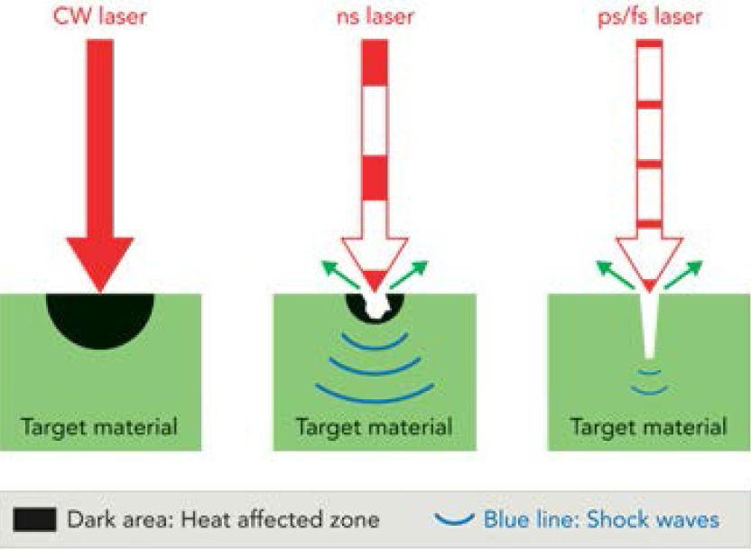 當激光以皮秒量級的脈沖時間作用到材料上時,加工效果會發生顯著變化。隨著脈沖能量急劇上升,高功率密度足以剝離外層電子。由于激光與材料相互作用的時間很短,離子在將能量傳遞到周圍材料之前就已經從材料表面被燒蝕掉了,不會給周圍的材料帶來熱影響,因此也被稱為“冷加工”。憑借冷加工帶來的優勢,短與超短脈沖激光器進入到工業生產應用當中。