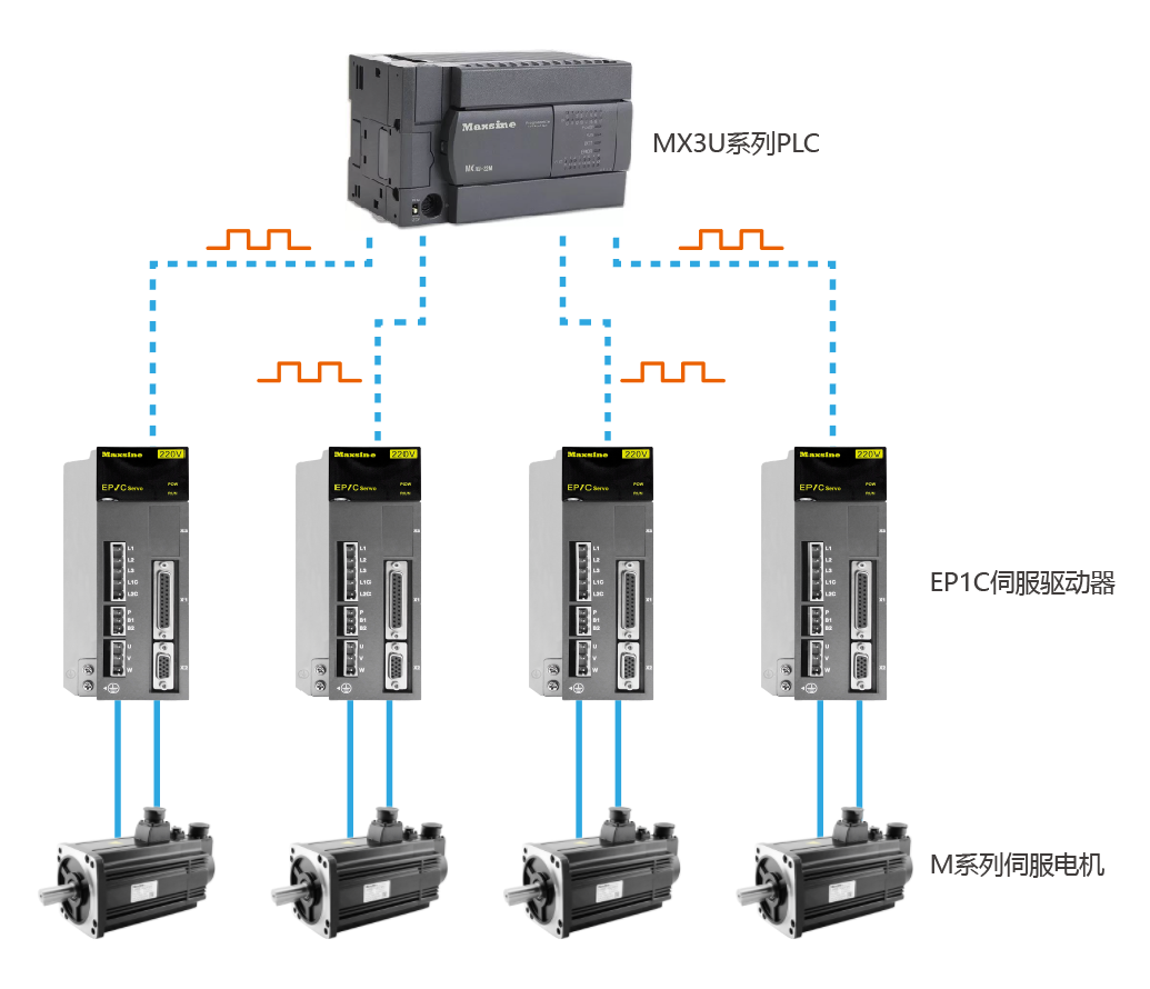 1、邁信PLC+4臺EP1C伺服驅動器+4臺邁信伺服電機