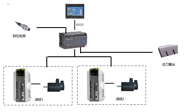 在電機生產過程中轉子需要特殊的絕緣紙來包裹,并且需求量大,要求能夠快速的定長剪切,此機器使用MX系列PLC進行位置控制實現兩種絕緣紙同時剪切,定位精度高,速度快慢可調,使用觸摸屏能方便修改各項參數。